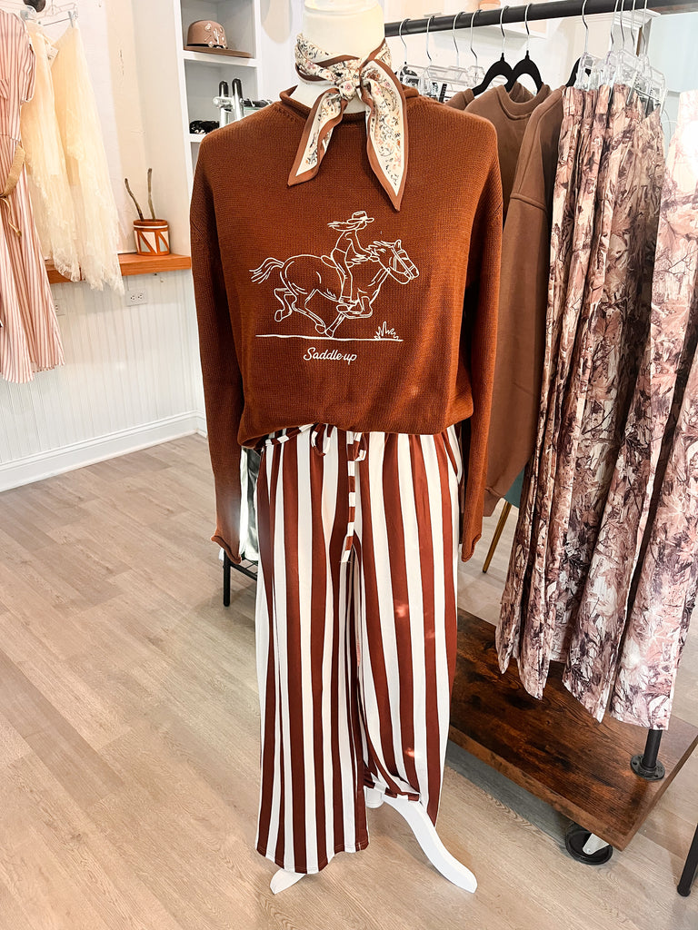Saddle up in style with our Embroidered Saddle Up Sweater. This cozy light knit sweater features a fully embroidered cowgirl on horseback, perfect for the cowgirl at heart. Its soft and breathable fabric makes it an effortless match with denim, boots, or shorts. Available in neutral cream and true to size.