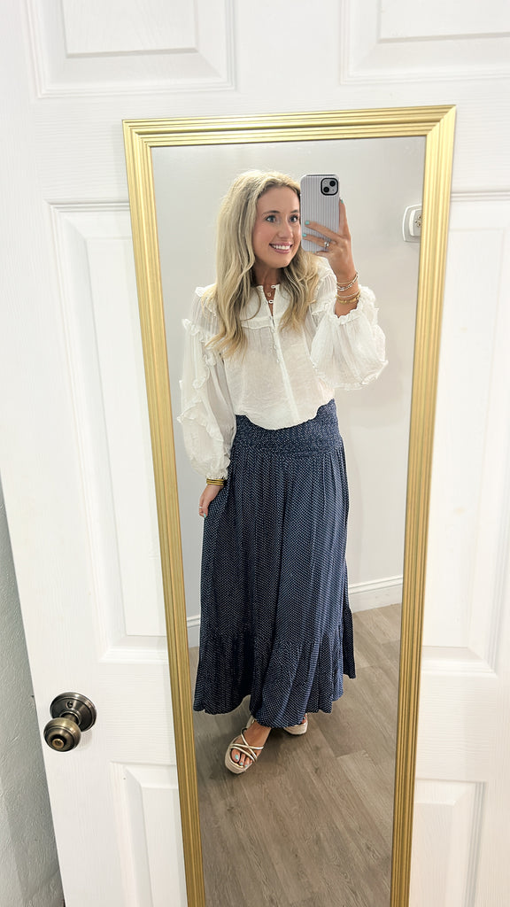 This navy polka dot maxi features a smocked waistband that hugs in all the right places without feeling tight, giving you that comfortable, flattering fit whether you’re dressing it up or keeping it casual. The flowy silhouette and soft ruffle hem add just enough movement to make it feel feminine without trying too hard.
